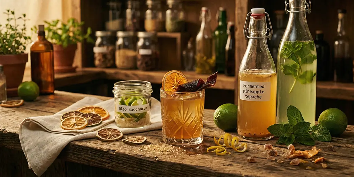 Dalam praktik sustainable bartending konvensional, sering kali hanya air perasan jeruk nipis yang diambil, sementara kulitnya dibuang begitu saja. Namun, dalam konsep zero waste, kulit jeruk tersebut memiliki nilai tinggi. Kulit buah dapat diolah menjadi oleo saccharum (minyak gula) untuk pemanis, dikeringkan menjadi garnish, atau difermentasi menjadi tepache atau cordial buatan sendiri.